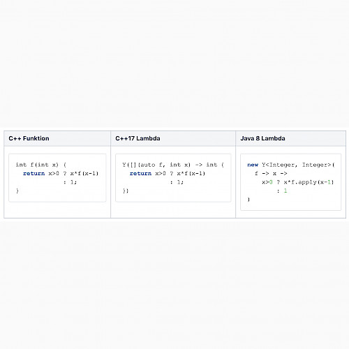 Schauen wir uns das Standardbeispiel für Rekursion an, nämlich die Fakultät. Als Funktion (in C++), sowie als Lambda in C++17 und Java sieht das so wie im Bild aus.